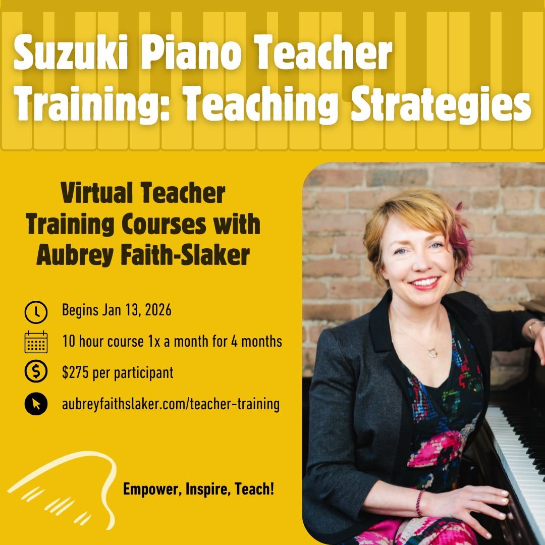 Aubrey Faith-Slaker offers comprehensive teacher training in the Suzuki Method of Piano study through immersive apprenticeship programs and online courses. Local groups meet regularly for in-depth, extended training, fostering a collaborative learning environment.